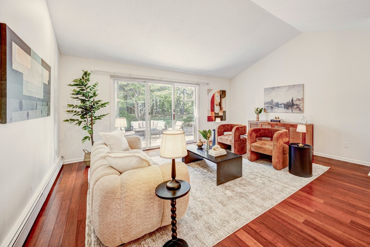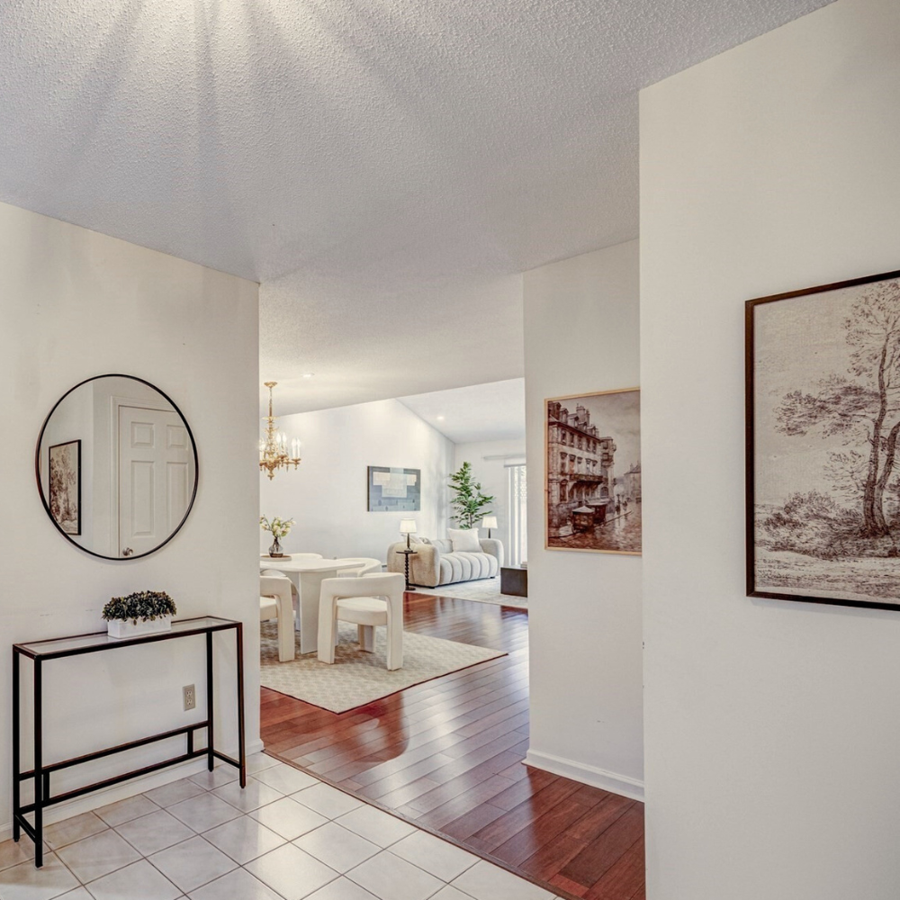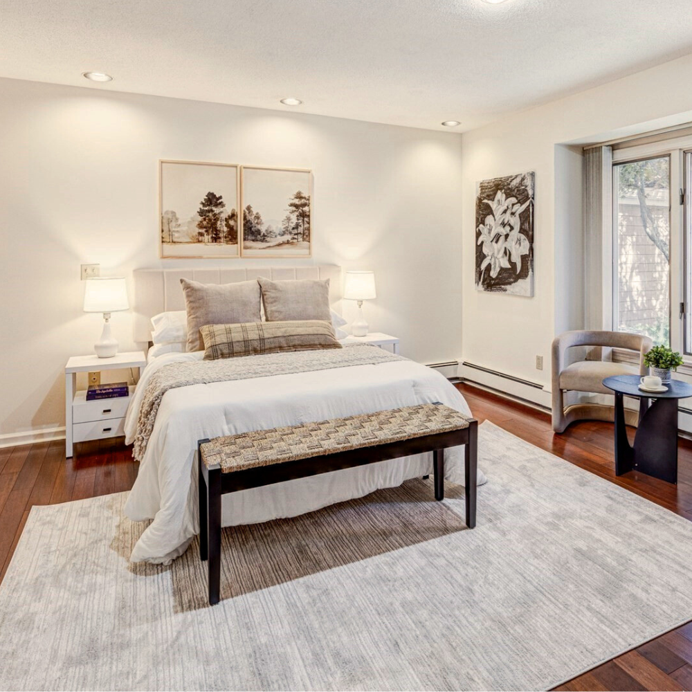 415 Dedham St, Unit D was a large, elegant condo Newton with beautiful outdoor spaces and floor to ceiling windows in the living room. The condo also had some beautiful traditional touches, including the gold chandelier in the living room and the stained glass lamp in the kitchen. As a stager, I wanted to bring in furniture and art that would have some traditional elements but also more modern ones that could update for today’s buyers. I chose soft, neutral furnishings with several statement pieces, including bold artwork and some black accent furniture. I think the overall effect was a unique blend of traditional and modern aesthetics. Before I staged this property, the property was listed on the market for 90 days with no accepted offers. A new agent took over, and after I staged it, the property was priced at $1.475M and went under agreement within 19 days during the off season.